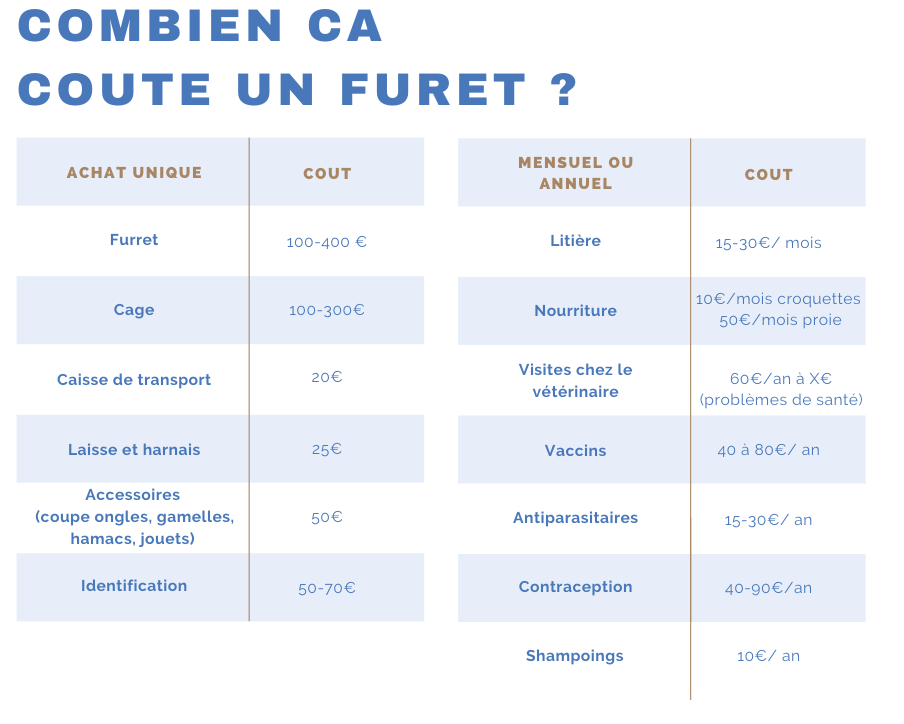 - coûts : le furet est un NAC, de ce fait les consultations vétérinaire sont plus élevées que pour un chien ou un chat, son alimentation, sa litière et les autres frais accumulés représentent une petite somme à l'année,