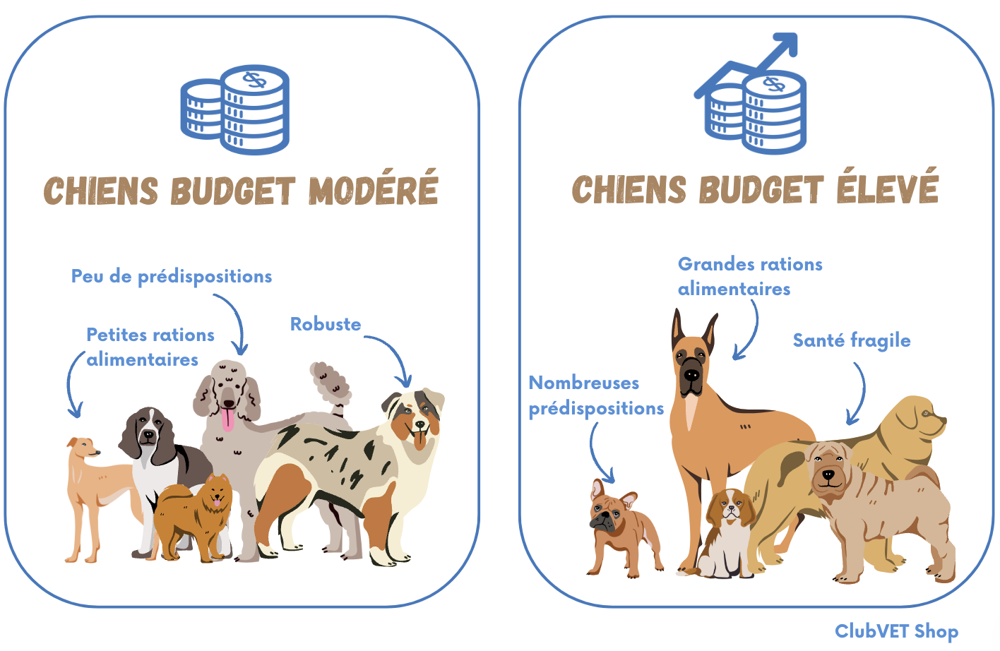 Le grand chien représente plus de frais car il mange beaucoup plus, il est sujet à certains troubles articulaires et digestifs et son gabarit exige plus de substances en cas de prestation vétérinaire.