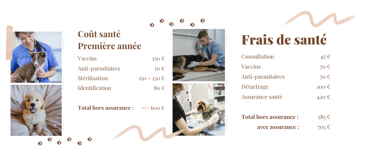 - Toilettage : utile pour les chiens à poils longs ou pour la coupe de griffe, 30 - 60 € par session ou 200 € / an.