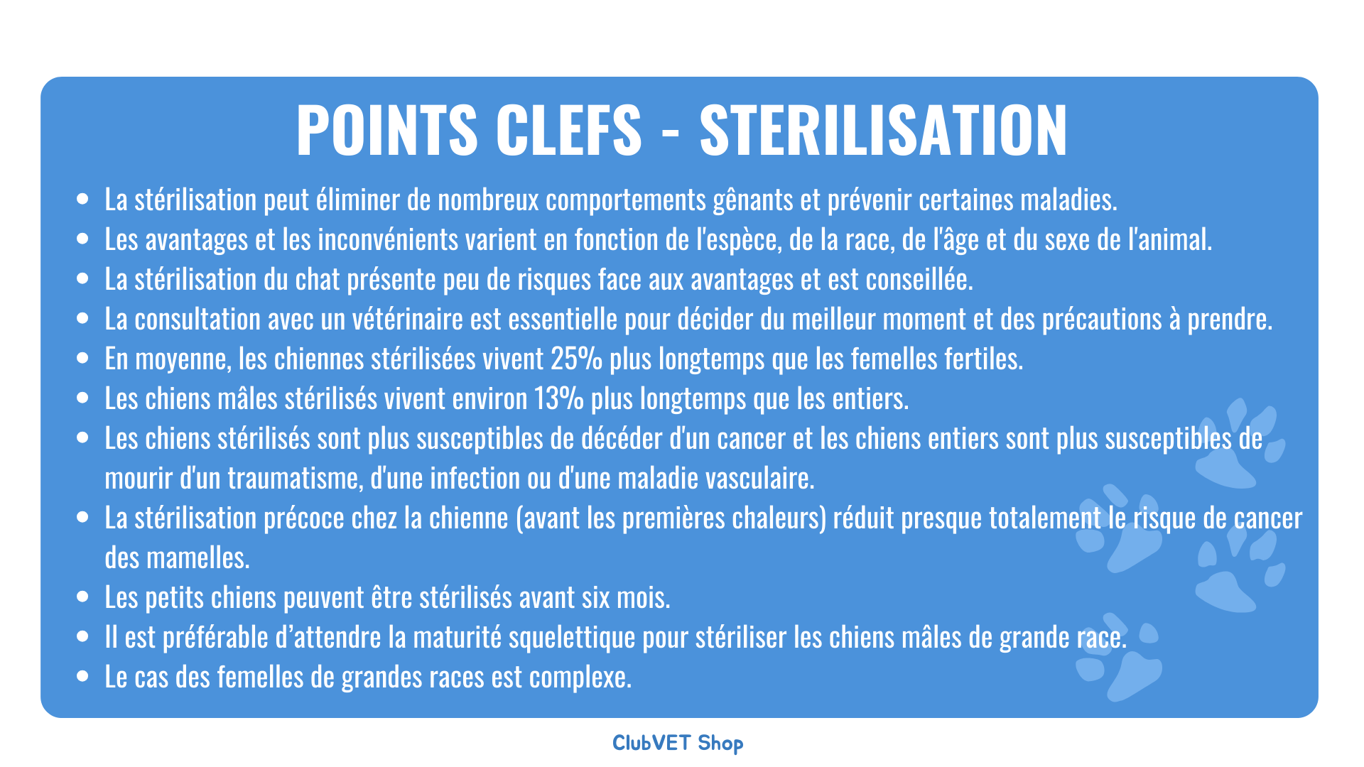 • Chez les chiens, chaque cas doit être évalué individuellement, en tenant compte des spécificités de la race, de l'âge et des conditions médicales préexistantes. La décision finale doit être prise en consultation avec un vétérinaire pour assurer la meilleure santé possible de l'animal.